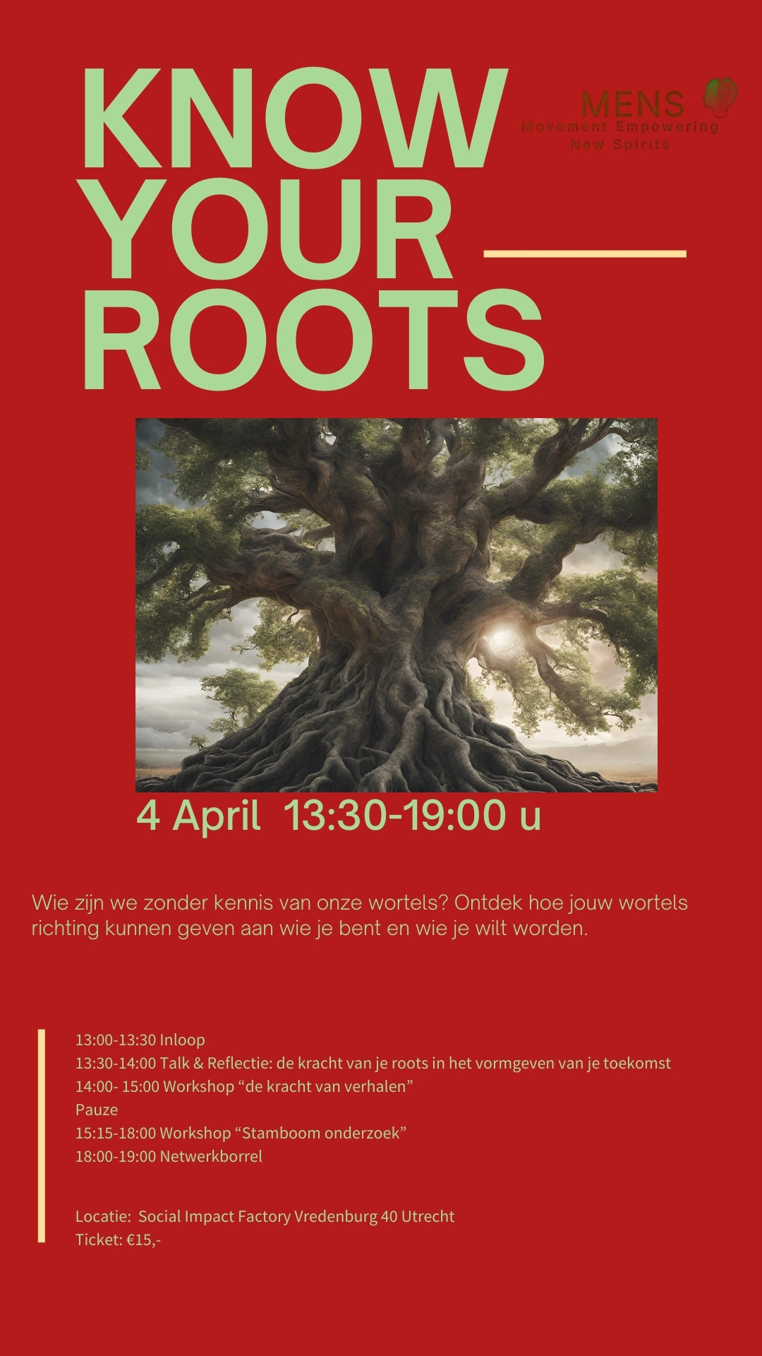Wie zijn we zonder kennis van onze wortels? Know Your Roots is een inspirerend evenement waarin geschiedenis, cultuur en persoonlijke verhalen samenkomen. We staan stil bij de betekenis van onze afkomst en onderzoeken hoe het verleden doorwerkt in onze identiteit, ons zelfbeeld en onze gemeenschap. Door middel van een lezing, interactieve workshops en open gesprekken creëren we een veilige ruimte om te leren, te reflecteren en elkaar te ontmoeten.