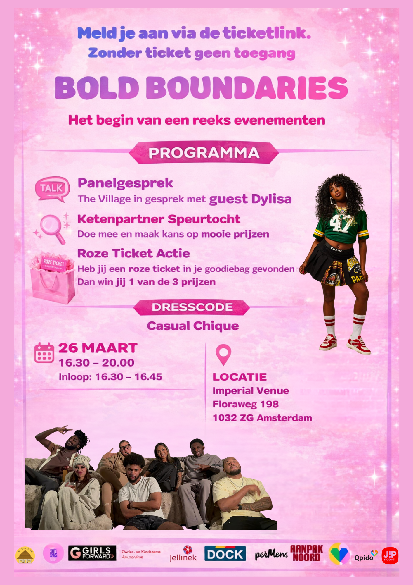 e bent van harte uitgenodigd voor het Bold Boundaries Begin Event – een inspirerende bijeenkomst waar verbinding, gesprekken en plezier samenkomen. Tijdens deze bijzondere middag en avond staat ontmoeting centraal. Laat je inspireren door een panelgesprek van The Village samen met onze special guest Dylisa, doe mee aan een ketenpartner speurtocht en maak kans op mooie prijzen. In de goodiebag zit misschien wel jouw gelukskaartje… Heb jij één van de roze tickets gevonden? Dan win jij één van de drie prijzen! Daarnaast zorgen wij natuurlijk voor lekker eten en een gezellige sfeer. Dresscode: Casual Chique