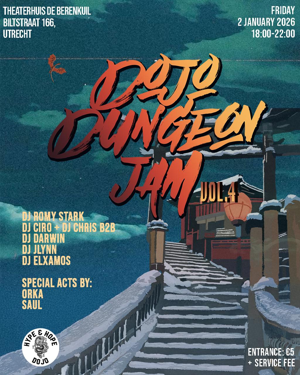 ⛩️ DOJO DUNGEON JAM – VOL. 3 ⛩️ Back by popular demand — the third edition of the community jam by Hype&Hope Dojo is HERE! Rooted in HipHop, built on connection, and driven by the culture. 🎶 Pure music. 🌀 Cyphers that flow. 🤝 A space for all of us. Let’s continue writing our story — together. Whether you came to vibe, dance, spin, or just feel the energy, this jam is by the community, for the community. 🎧 LINE UP DJ ELXAMOS DJ JLYNN DJ ROMY STARK DJ DARWIN DJ CHRIS & DJ CIRO BACK TO BACK 📍 Theaterhuis De Berenkuil – Biltstraat 166, Utrecht 🇳🇱 📆 2 JANUARY | Doors: 18:00 🎟️ Only 50 tickets | €5 + €1.58 service 🚍 OV: Oorsprongpark (1 min walk) (FROM UTRECHT CENTRAL STATION TAKE THE BUS TO "OORSPRONGPARK") use www.9292.nl to check the bus travel system. 🚗 Parking: Hoefijzerstraat, Utrecht 📲 Follow: @hypeandhopedojo 📩 Questions? hypeandhopedojo@gmail.com 🏯audition info on location or email! VOL. 4 IS LOADING... Let’s make more memories. 💥 Full = Full, don’t miss out! #DojoDungeonJam #HipHopCulture #CypherVibes #HypeAndHopeDojo